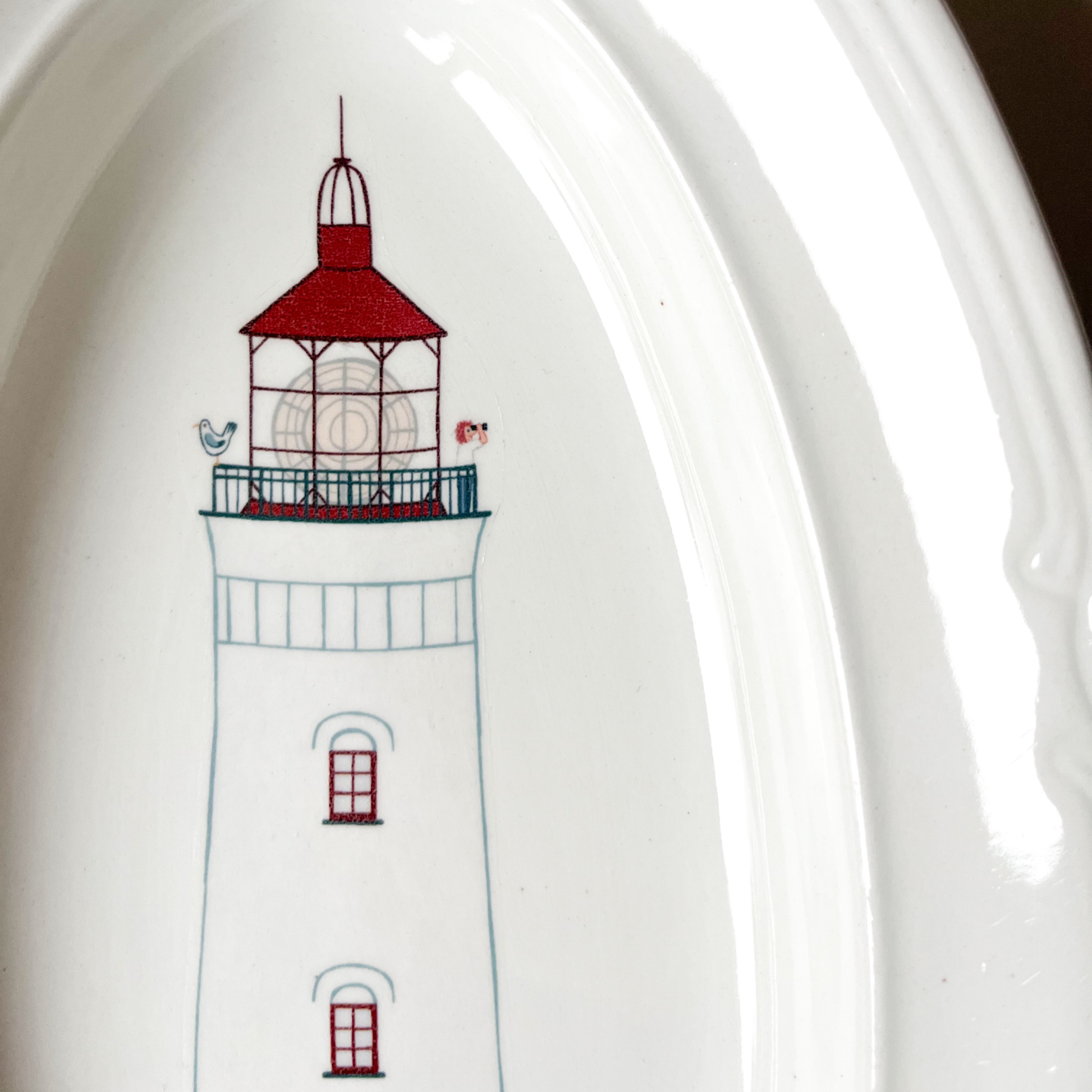 Deze mooie witte serveerschaal kreeg van mij een witte vuurtoren, mét vogel en mannetje met een verrekijker. De illustratie van de vuurtoren is geïnspireerd op de Lyngvig Fyr vuurtoren bij het Deense Hvide Sande.
