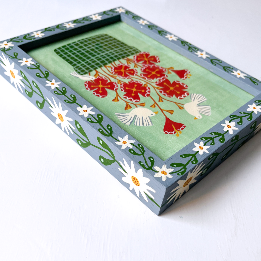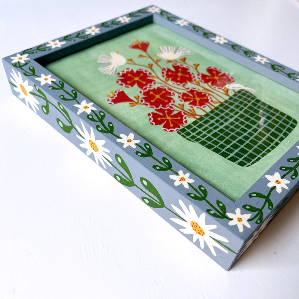 In de lijst bevindt zich een schilderij op papier van een groen bloempotje met rode bloemen en sierlijke witte 'vogel-bloemen'. Het tafereel voelt zacht, vrolijk en een tikkeltje sprookjesachtig aan – een klein, uniek en handgemaakt kunstwerkje dat warmte brengt in elke ruimte.