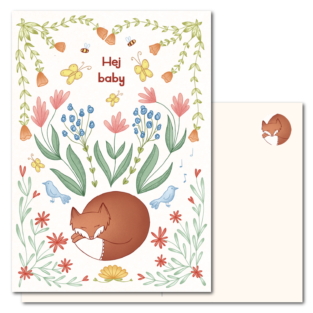 Deze handgetekende ansichtkaart met de tekst 'Hej baby' toont een slapend vosje, omringd door bloemen, vlinders, vogels en bijtjes. Een warme en lieve illustratie die perfect past bij de geboorte van een baby.