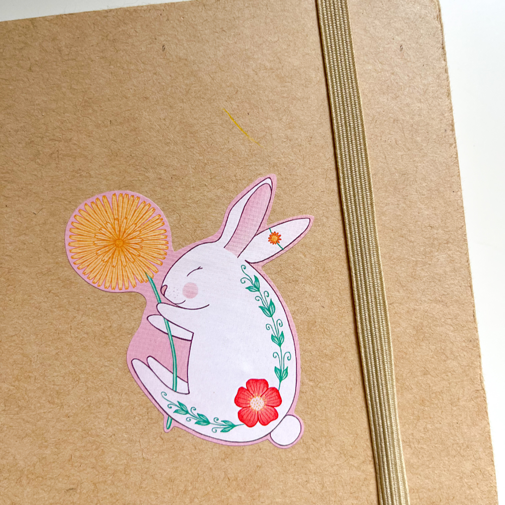 Schattige sticker van een slapend konijntje met een paardenbloem tussen haar pootjes en een folkore art illustratie van een bloem op haar zij. Leuk om je cadeautje mee af te maken, mee te sturen met snailmail of om je notitieboek, laptop, telefoon of iets anders mee op te vrolijken. De sticker is contourgesneden. Gemaakt van vinyl, dus sterk en duurzaam voor binnen en buiten.
