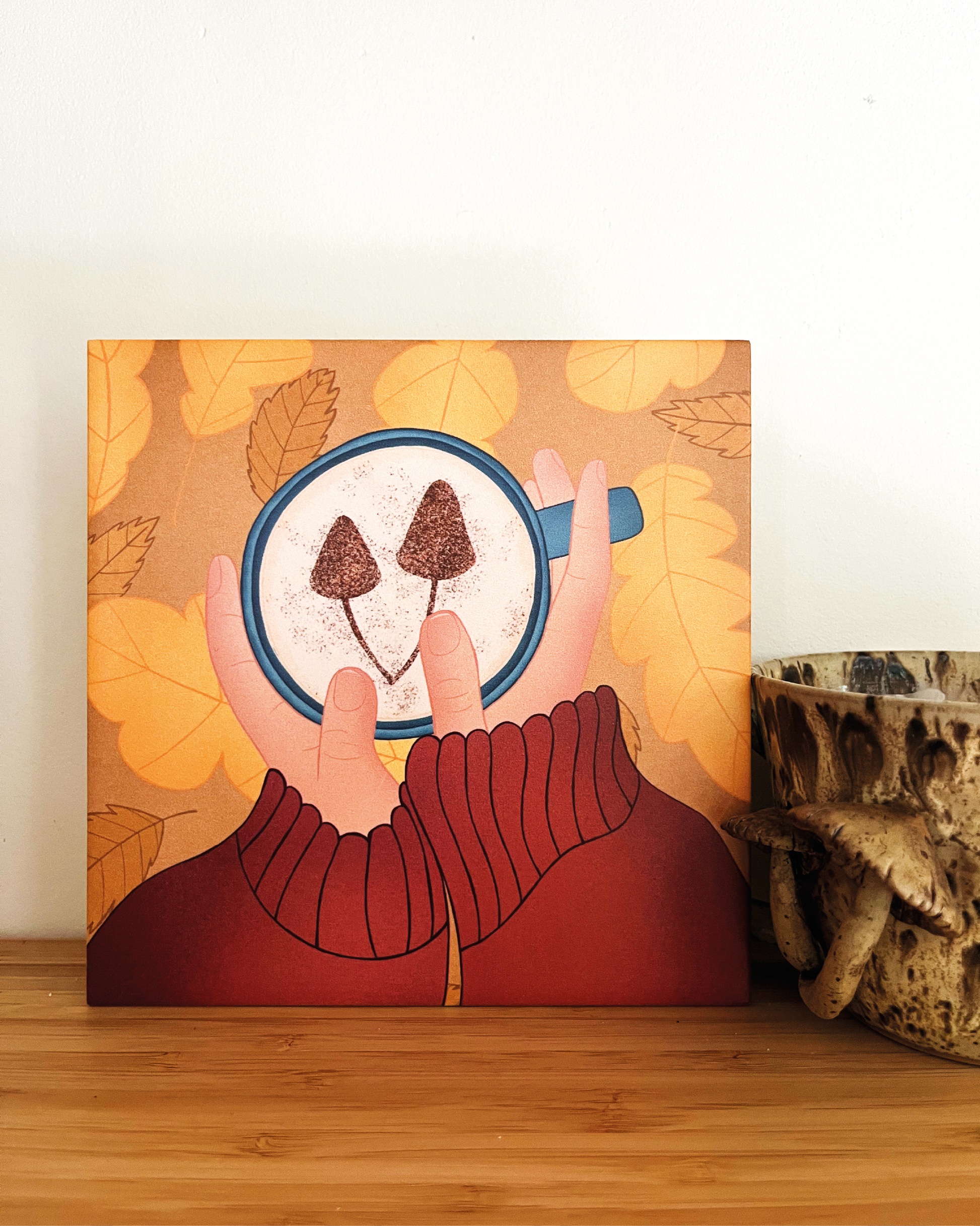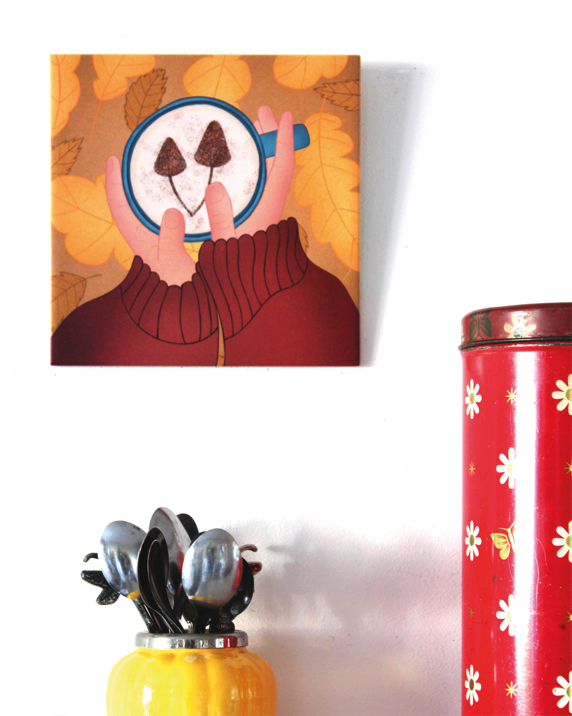 Deze sfeervolle tegel legt de herfstsfeer helemaal goed vast: met blaadjes op de grond en een warme cappuccino om je handen aan op te warmen. De kleuren zijn helemaal passend bij het seizoen en de paddenstoelen van cacaopoeder maken het plaatje compleet. Leuk voor in de keuken, naast het koffiezetapparaat :)